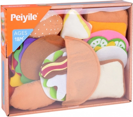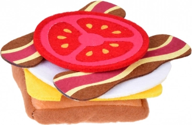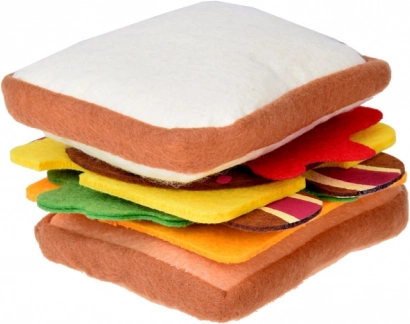 Dette rige sæt indeholder alt, hvad der er nødvendigt for at lave tre typer “sandwiches” – fra toast over pita til bolle. Børn kan frit lægge lag af salat, tomat, agurk, løg og den utraditionelle “syltede melon”, og supplere med skinke, bacon, salami, roastbeef, kalkunskive, æg og ost. Gennemtænkte former og farver giver et realistisk udtryk, mens alle elementer er bløde og sikre.