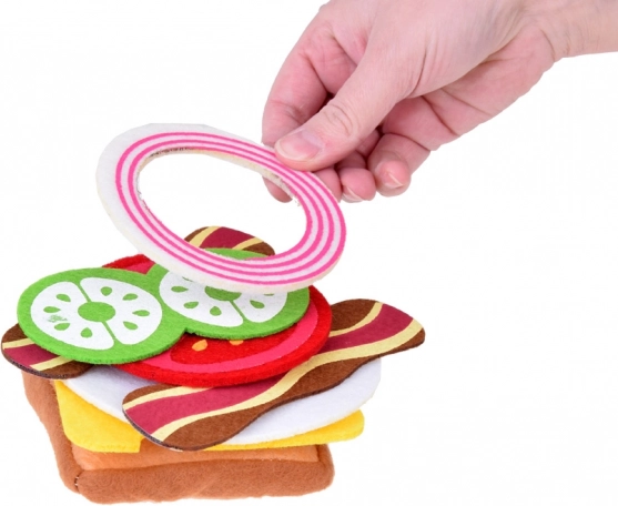 Børn lægger brød, grøntsager, ost og “kød” i lag og skaber deres egne opskrifter. Ideelt til rolleleg og til at lære farver og former.