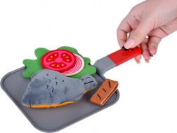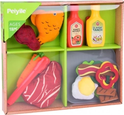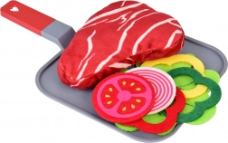 Fra steak og fisk til æg og bacon samt tomat, løg, salat, gulerod og peberfrugter – sættet fremmer kendskab til madvarer og balanceret kost gennem leg.