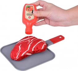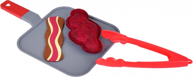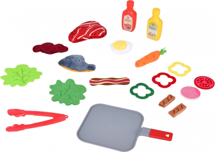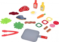 I pakken finder du praktiske tilbehør – pande og tang – samt et farverigt udvalg af madvarer: steak, fisk, kyllingefilet og strips, æg, bacon, skiver af tomat og løg, salatblade, gulerod, peberfrugter og to slags sauce (ketchup og alsidig dressing). Dermed kan børn tilberede utallige “opskrifter” og øve kokkeroller.