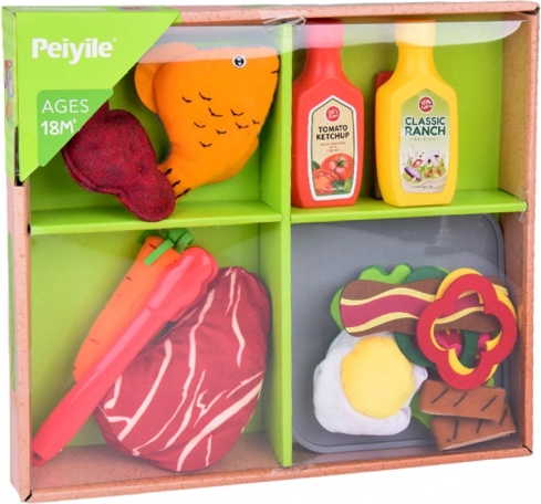 Dette omfattende sæt af tekstil-madvarer giver børn glæden ved at lege kok. Realistiske former og farver understøtter naturlig læring om madvarer og udvikling af færdigheder i servering og madlavning. De bløde materialer er skånsomme mod børnehænder og ideelle til daglig leg.