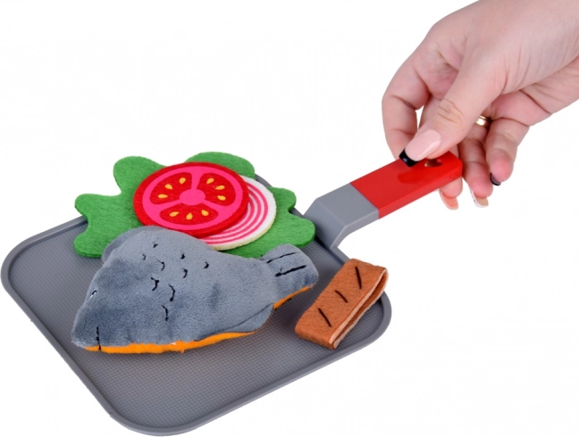 Oplev kreativ leg i køkkenet med et blødt madlavningssæt til børn. Farverige tekstil-madvarer og plastredskaber styrker fantasien, finmotorikken og sunde vaner. I sættet finder du pande og tang, dele som steak, fisk, kyllingefilet og strips samt populære æg, bacon, grøntsager og saucer – alt er sikkert og behageligt at røre ved.