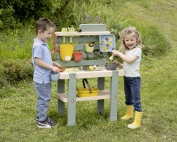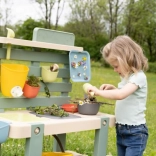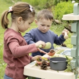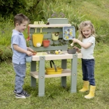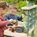 Dette robuste udendørskøkken i naturfarver giver børn et autentisk rum til leg og eksperimenter med vand, sand og naturmaterialer. Aftagelige bokse gør håndtering og oprydning let, mens hanen med drejelukning hjælper med dosering af vand og udvikler finmotorikken.