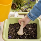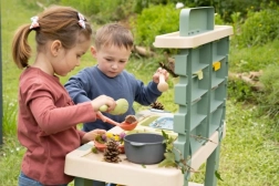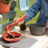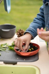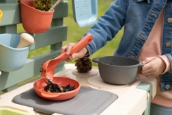 Si, kurv, øse, rive, skovl og andet tilbehør inspirerer til madlavning af mudder, sand og blomster og støtter fælles leg.