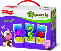 Far Far Land puslespil tre-sæt tilbyder en fantastisk verden fuld af farverige billeder. Hvert sæt indeholder 8 unikke motiver, som hver består af 3 brikker. Disse puslespil støtter ikke kun børns kreativitet, men også deres evne til at forbinde og skelne mellem forskellige objekter.