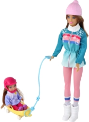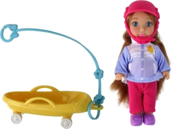 Oplev vinterens magi med mor og datter på kælk. Den store dukke har langt brunt hår og en varm hue, den lille dukke bærer en lyserød hjelm for mere sikker leg. Pastelfarvede vinteroutfits med snefnug understreger stemningen af snedækkede eventyr, og den gule kælk indbyder til endeløs kørsel.