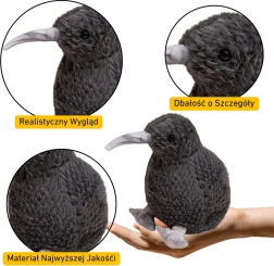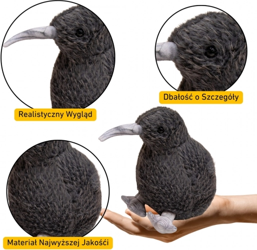 Denne plyskiwi i elegant sort er designet med sans for detaljer – det lange næb, de korte ben og den bløde overflade giver et naturtro billede af denne unikke fugl. Med en kompakt højde på 17 cm ligger den godt i en barnehånd og bliver en yndet følgesvend til både leg og søvn.