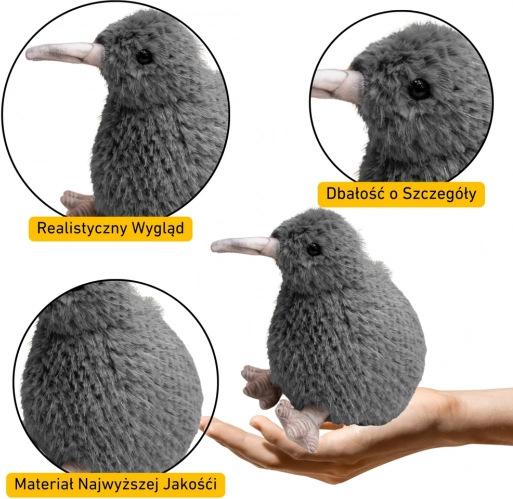 Sød plysbamse af en kiwi-fugl på 17 cm i ekstra blødt materiale, der glæder både børn og dyreelskere. Den byder på realistisk design, blød og behagelig udførelse og opfylder sikkerhedsstandarderne CE og EN71. Perfekt som krammebamse til sengetid og som stilfuld dekoration til børneværelset.