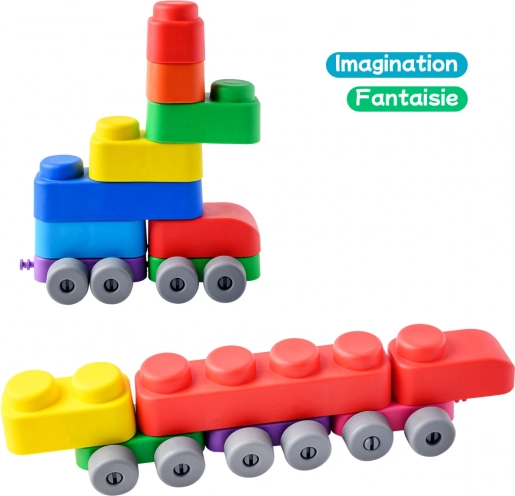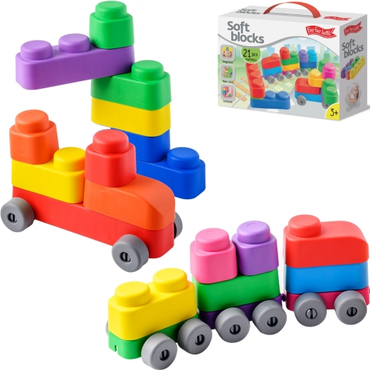 Byggesæt Far Far Land er et sjovt og kreativt legetøj til børn! Indeholder 21 bløde blokke og 16 hjul, som støtter udviklingen af motorik og fantasi hos dine børn.