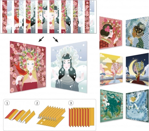 DJECO-sæt Kinetiske billeder Dronninger: lav 4 dekorative billeder med optisk effekt, to motiver i ét. Kreativ sjov for børn fra 7 år.