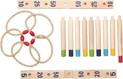 Oplev sjov med træspillet med ringkast. Målet er at kaste fem flettede reb-ringe på et træ-kors med pinde og få flest mulige point. Dette spil er fremragende til at udvikle fingerfærdighed, tålmodighed og koncentration. Spillet indeholder: