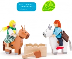 Sættet indeholder to figurer, to heste og en trækasse med grøntsager, så børn kan gå i gang med deres egne scener med det samme. Legen understøtter udviklingen af fantasi, hånd-øje-koordination og finmotorik.