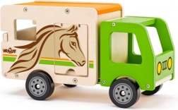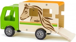Oplev en kvalitets træhestetransportør med rullende hjul og nedklappelig rampe for nem læsning. Inkluderer figurer af en rytter og en amazone, to heste og en kasse – ideel til kreativ leg og finmotorisk udvikling for børn fra 3 år. Køretøjsmål 30 × 13 × 9 cm, CE-certificeret.