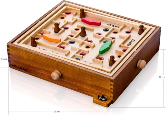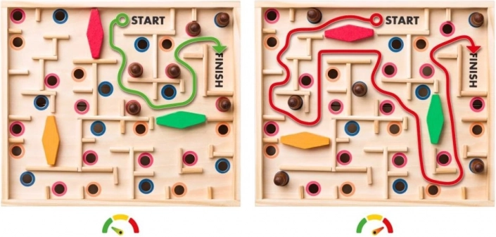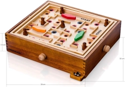 Den træbaserede vippe-labyrint er et klassisk bordspil, der udfordrer både børn og voksne i præcision og koncentration. Målet er at føre kuglen sikkert gennem det snørklede labyrint fra START til FINISH uden at lade den falde i hullerne. Den robuste trækonstruktion er behagelig at røre ved og tåler hyppig brug.