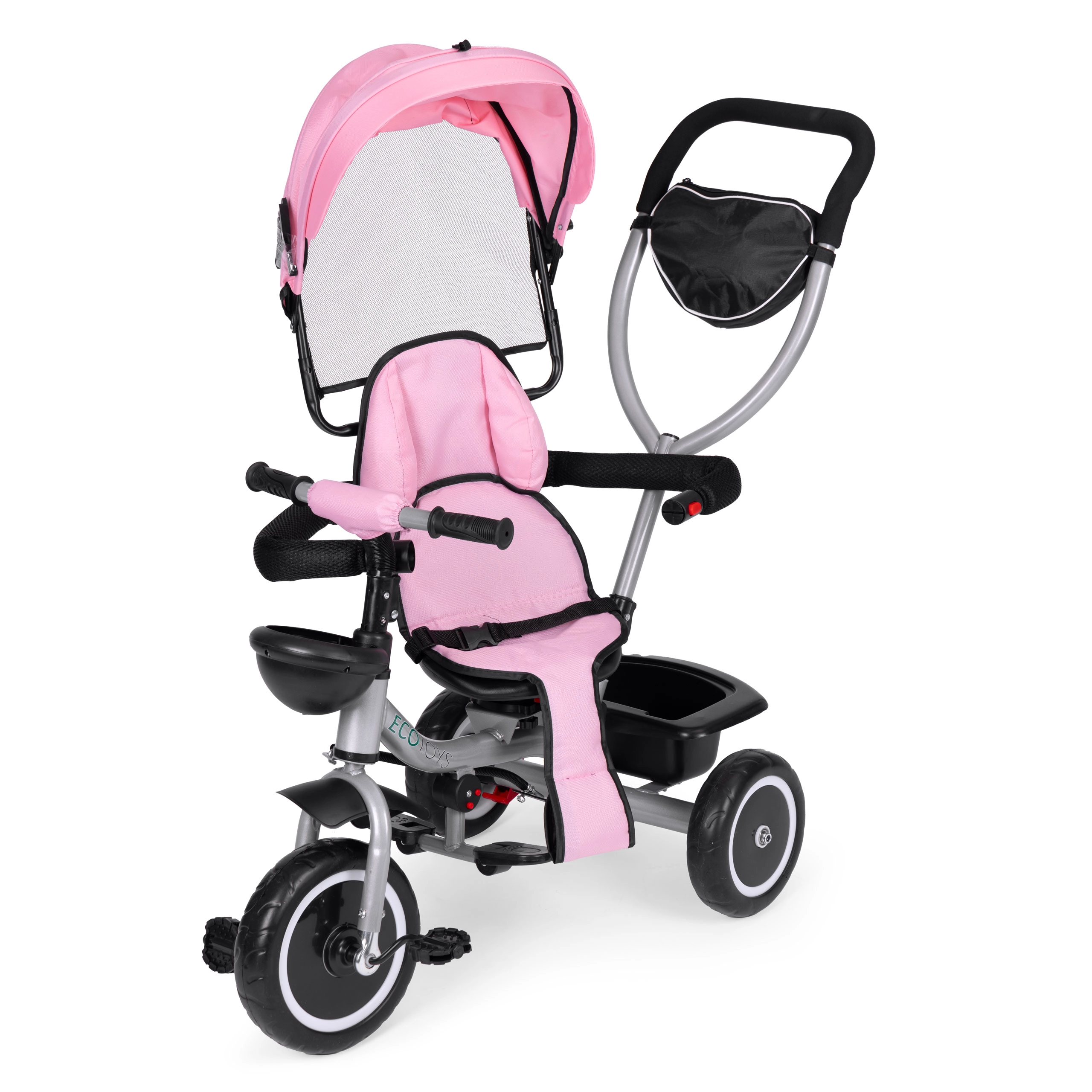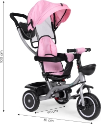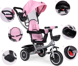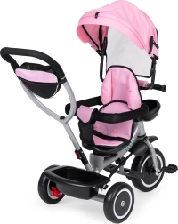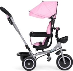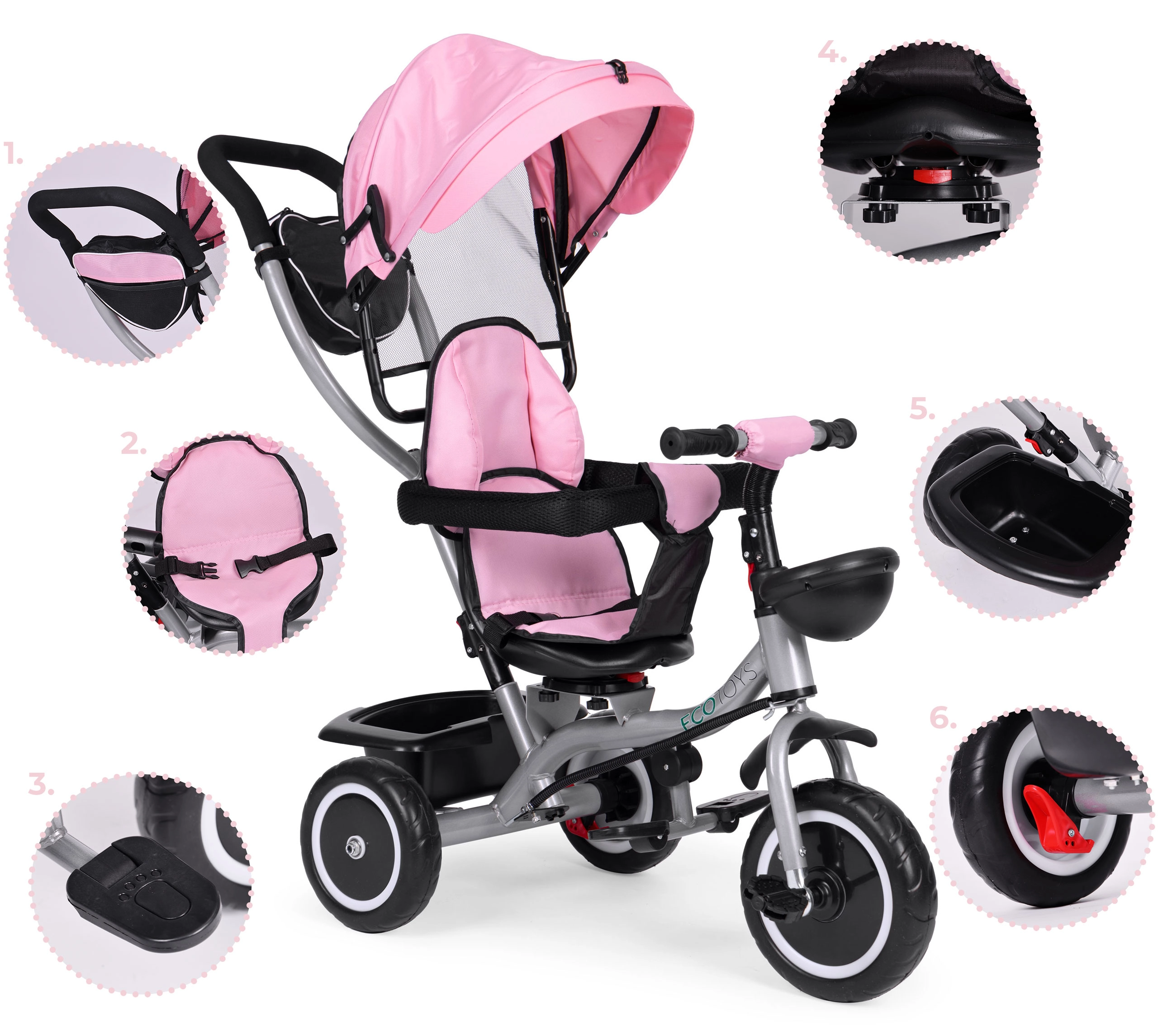 Denne multifunktionelle trehjulede cykel kombinerer komforten ved en klapvogn med glæden ved den første tur. Takket være det drejelige sæde kan barnet køre vendt mod forælderen eller i kørselsretningen. Den sammenklappelige kaleche beskytter mod sol, vind og let regn, og forældre-styrehåndtaget sikrer fuld kontrol over retningen.