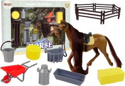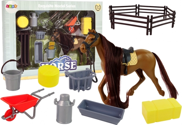 Dette detaljerede sæt med hest indeholder alt, hvad børn behøver til staldleg og dyrepleje. Hesten har en smuk man, perfekt til redning og fletning af fletninger, og både sadel og trense er inkluderet. Der medfølger indhegning, hø og praktiske redskaber til den daglige pleje.
