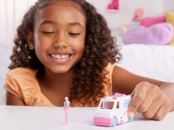 Der medfølger en miniaturedukke, som bøjer i taljen, så hun kan sidde komfortabelt i kabinen og inde i interiøret. Rullende hjul og en åbningsbar sideklap understøtter realistisk leg og udvikler børns fantasi. Sættet er perfekt til små BARBIE-fans og samlere af miniaturer.