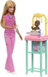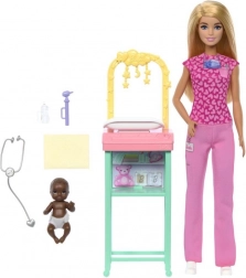 Opdag lægeverdenen med Barbie som børnelæge! Dette legesæt inkluderer Barbie i en lyserød lægedragt og hendes lille patient. Børn kan nyde en leg, der fremmer pleje og ernæringsevner.