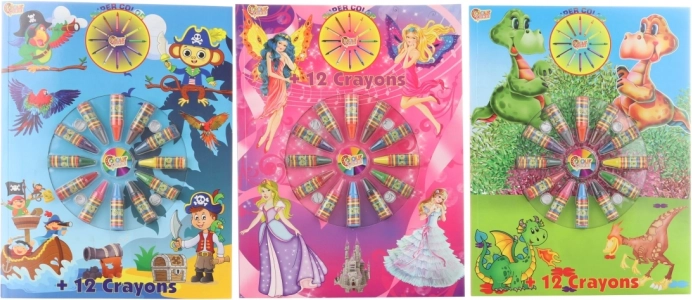 Oplev en sjov verden med disse malebøger i A4-format, som indeholder motiver af pirater, dinosaurer og prinsesser. Hver pakke er suppleret med 12 farvede voksfarver, ideel til børn fra 3 år.