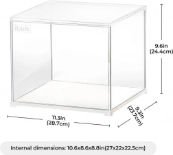 Den er designet til miniaturedukkehuse i DG-serien (undtagen DG12). Det indvendige mål 22 × 22 × 22,5 cm er ideelt til de fleste scener, mens de udvendige mål 28,7 × 23,7 × 24,4 cm giver stabilitet og beskyttelse. Takket være den smarte konstruktion kan vitrinerne stables i op til 6 lag og dermed spare værdifuld plads på hylde eller bord.