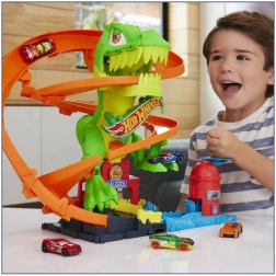 Gør dig klar til en spændende tur i Hot Wheels City! Slip den medfølgende metalbil i 1:64 løs og kør forbi T‑rexen. Hver gang bilen passerer, drejer dinosaurens øjne, indtil den til sidst falder besejret. Børn kan afprøve forskellige scenarier – fra lynhurtig tankning til heroisk sejr, der redder hele byen.