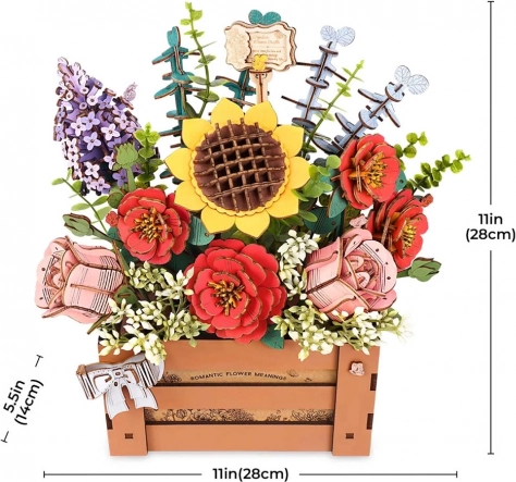 Skab en tidløs dekoration og en anderledes gave i form af en farverig buket i træ, som du selv bygger. Blomsterne visner aldrig, har et realistisk udseende og tager sig smukt ud i vinduet eller på hylden. Sættet indeholder en solsikke, en lyserød rose, en rød kamelia, lavendel, syren og grønne planter, hver med sin symbolske betydning. Uden lim, med præcist laserudskårne dele for et stabilt og holdbart resultat – ideelt til børn fra 14 år og voksne.