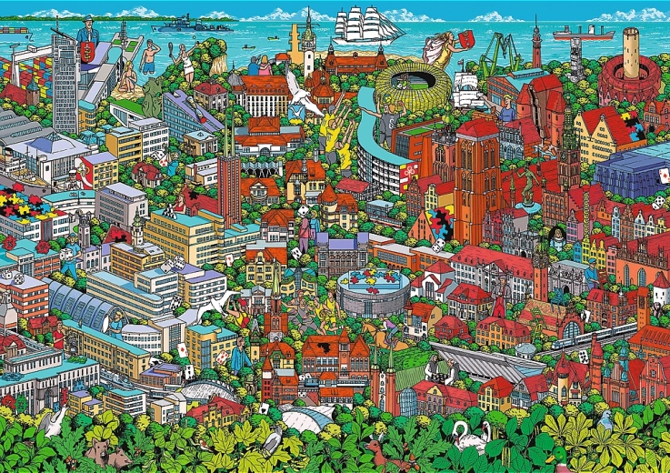 Den begrænsede udgave TREFL Premium Plus Share the Moments: Tricity byder på en kunstnerisk illustration, der forbinder Tricitys arkitektur med TREFL-mærkets typiske symboler. Under lægningen opdager du legende detaljer som tagsten formet som puslespilsbrikker og basketballspillere indsat i urbane scenerier.