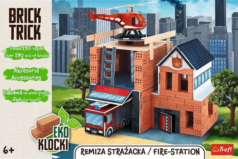 Byg din egen brandstation af ægte lersten og træplanker. Sættet BRICK TRICK tilbyder over 190 mursten, genbrug takket være vandopløseligt lim og rige dekorationstilbehør for et realistisk udseende. Perfekt til udvikling af finmotorik, kreativitet og koncentration hos børn fra 6 år.