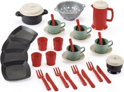 Stor gennemsigtig taske med fire tallerkener, bestik, kopper, krus med underkopper, kande, sukkerskål, si og gryde med låg. Fantastisk børnesæt til sjov leg.