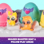 Oplev et unikt klækkeøjeblik med multi-pakken Hatchimals Sky med neonregnbue. Træk blot sutterne ud af æggene, fyld flasken med vand og klem forsigtigt et par dråber i æggene – inden for få sekunder dukker nye figurer op: Bunnypie, Puppadee og Narwing. Uden for æg venter også Kittingale og Foxstritch. Alt kan udstilles i forårskurven med indbygget sæde og lille pude.