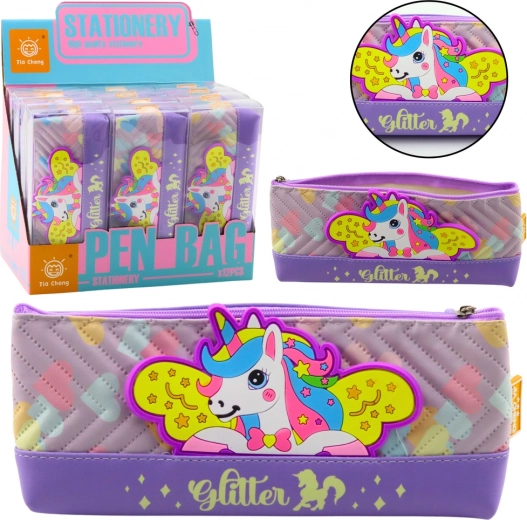 Et vidunderligt enhjørningsformet penalhus, lavet af læderlignende materiale, er perfekt til skoleartikler. Dets lilla udseende med enhjørningsmotiv vil fascinere ethvert barn.
