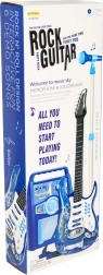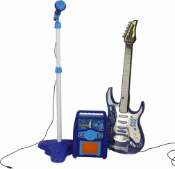 Sættet indeholder en elektrisk guitar, forstærker og mikrofon på et justerbart stativ for en realistisk oplevelse.
