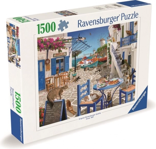 Nyd afslappende stunder med et flot motiv af katte på solrige Mykonos. Ravensburger-puslespil er kendt for deres perfekte pasform, dybe farver og holdbar karton, som bevarer formen selv efter gentagen brug. Størrelsen på 1500 brikker giver en ideel udfordring for både øvede og passionerede puslere.