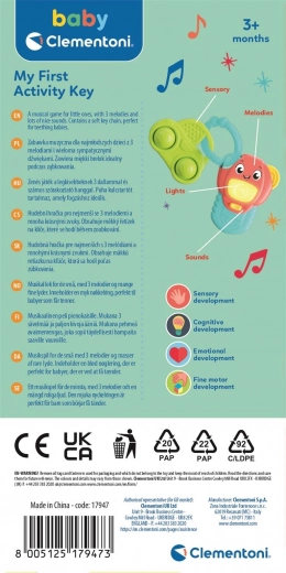 Den interaktive nøgle BABY CLEMENTONI er udviklet til både leg og udvikling i barnets første levemåneder. Med behagelige melodier og lyde styrkes den auditive sans, mens den bløde bidering giver lindring ved tandfrembrud. Det farverige design og de sikre materialer indbyder til udforskning og fremmer finmotorikken.