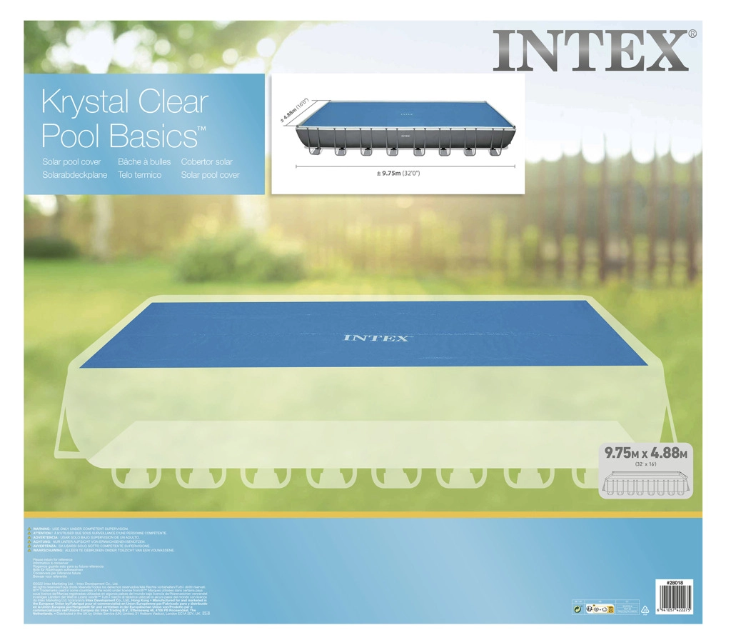 Intex solardækken er det ideelle valg til at holde vandtemperaturen i poolen og reducere fordampning. Dette dækken er beregnet til pools på 9,75 × 4,88 m, hvilket svarer til målene 960 × 466 cm.