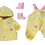 Sættet indeholder en regnfrakke, bukser og gummistøvler, hvilket sikrer komplet beskyttelse og stil til din dukke.