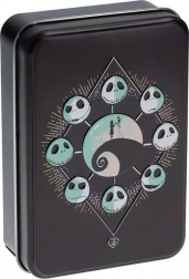 Den sorte metalæske med motiv af Jack Skellington og Sally er ideel til opbevaring og holder dine kort sikre.