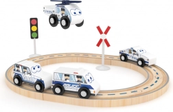 Dette trætog-sæt med skinner i polititema giver børn timevis af kreativ leg. Takket være den robuste trækonstruktion og skånsomme produktion uden kemikalier er det ideelt til daglig leg og de første banebyggerier. Sættet indeholder skinner og køretøjer, som børn nemt kan gribe og kombinere til deres egne historier.