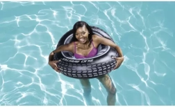 Baderingen har et autentisk udseende af et bildæk, hvilket både tiltrækker børn og voksne og tilføjer et sjovt element til enhver pool.