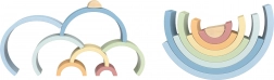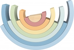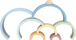 Sættet indeholder 8 halvcirkelformede dele i forskellige størrelser og blide farver, som kan stables til en regnbue, broer, tunneller og fantasifulde konstruktioner.