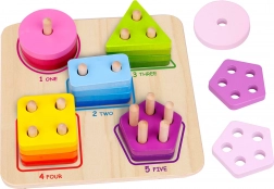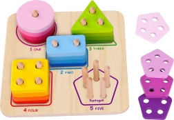 På træbasen er der markeret tallene 1–5 og navne på formerne på engelsk, hvilket naturligt understøtter grundlæggende fremmedsprog. Legetøjet er glat forarbejdet, sikkert og farverigt attraktivt, hvilket stimulerer synssansen og lysten til at udforske.