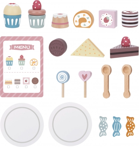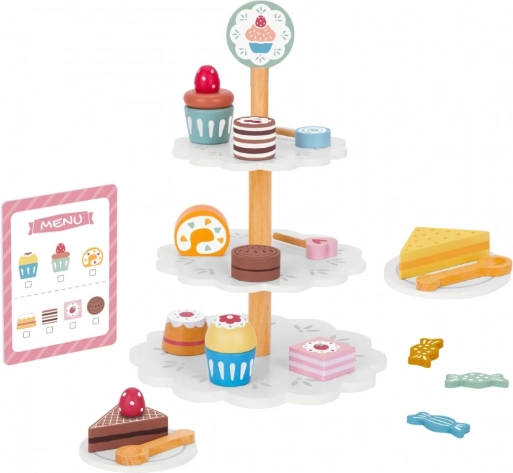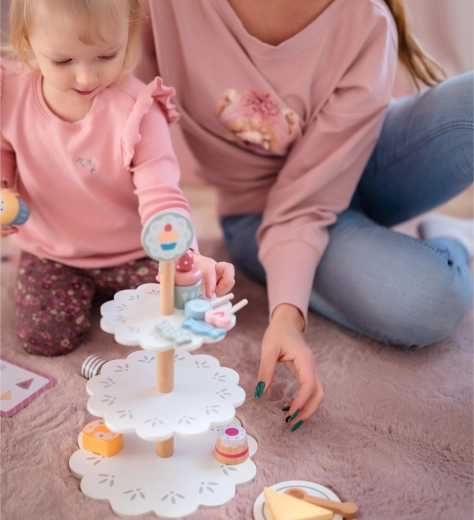 Dette elegante træstativ i konditorstil giver børnene realistisk serveringsleg. Med 3 niveauer har små konditorer masser af plads til cupcakes, kager og småkager, mens tallerkener og skeer inviterer til en fælles “teselskab”-stund.