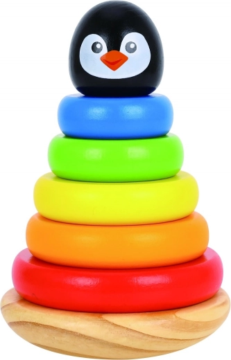 Dette træ-stabeltårn med glade farver og pingvinmotiv er ideelt til mindre børn. I pakken finder du en stabil base med pind og flere farvede træringe, som børnene kan bygge deres eget tårn med. Legen stimulerer sanserne, støtter koncentrationen og giver glæde ved hver vellykket stabling.
