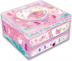 Opbevar dine værdigenstande i et smukt musikalsk smykkeskrin med ballerina-motiv. Når det trækkes op og åbnes, spiller det en blid melodi, der vil fortrylle enhver lille prinsesse.