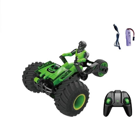 RC trehjulet i grøn farve tilbyder transformationsfunktion og stunttricks for en uforglemmelig køreoplevelse. Den er velegnet til sjov i det fri takket være sin maksimale hastighed på 8 km/t og rækkevidde på fjernbetjeningen på 25 meter.