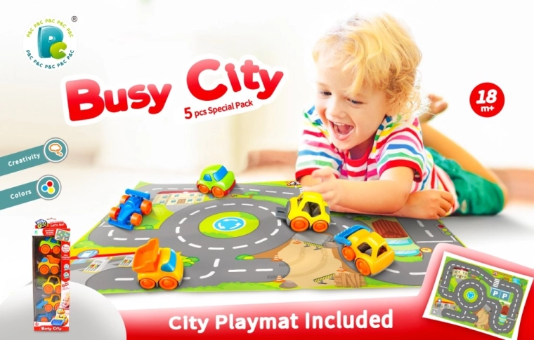 Et sjovt sæt til små chauffører med 5 legebiler i en størrelse, der passer perfekt til små børnehænder, samt en praktisk by-måtte med veje. Understøtter finmotorik, grebstræning og fantasi i legen. Velegnet fra 18 måneder.