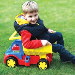 Børnelastbil Gigant 55 cm er en stor lastbil med en længde på 55 cm, som børn vil elske på grund af muligheden for at laste, aflæse og transportere deres yndlingslegetøj. Den er udstyret med et for- og baghåndtag til tilkobling af en vogn eller line til trækning. Den tippende kasse med komfortabelt håndtag gør det let at betjene og giver endeløse spillemuligheder. Med en belastningskapacitet på op til 150 kg er lastbilen også ideel som balancecykel - de mindste kan sidde på legetøjet og skyde sig fremad med benene. Den robuste konstruktion sikrer holdbarhed, så den er ideel til leg både udendørs og indendørs.