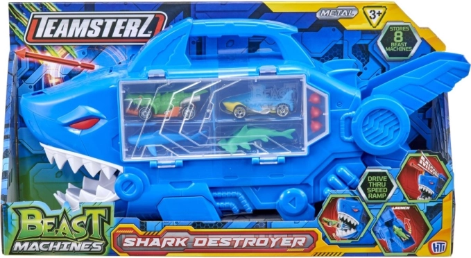 Teamsterz hajødelægger med rampe og 2 biler. Opbevarer op til 8 biler, affyrer projektiler og kører gennem kæberne. Sjov, bærbarhed og færdighedsudvikling til børn 3+.
