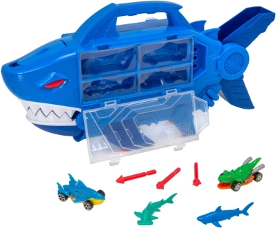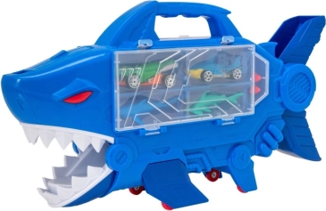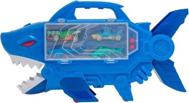 Nyd en actionfyldt tur med TEAMSTERZ hajkøretøj! Denne originale transporter og garage i ét rummer op til 8 metalbiler, har en udklappelig indvendig rampe, fritløbende hjul og praktisk håndtag. Tryk på knappen og affyr projektiler fra hajens hoved, kør gennem hajens kæber og nyd den hurtige bane. En fantastisk legetøj til udvikling af finmotorik og fantasi, egnet fra 3 år.