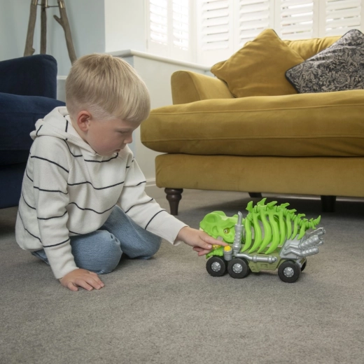 Tag på et forhistorisk eventyr med bilen TEAMSTERZ T‑Rex! Denne originale dino-bil med lyde af en brølende T‑Rex, blinkende gult øje og åbnende kæber under kørsel forvandler enhver leg til et spændende show. I brystkassen kan du desuden opbevare dine yndlingsbiler. Batterier er inkluderet i pakken.